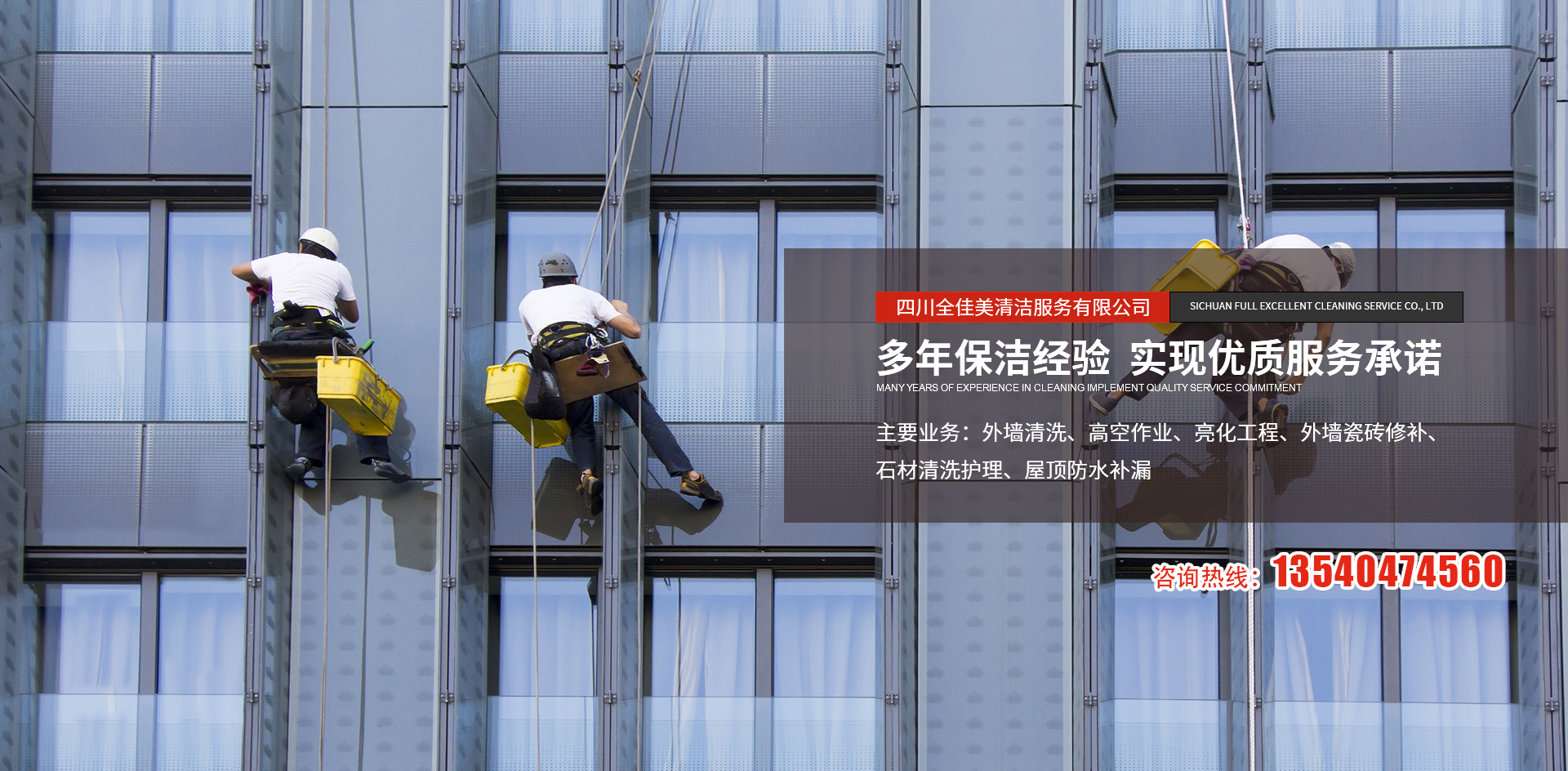 四川全佳美清潔服務(wù)有限公司成立于2017年11月20日,注冊(cè)資本200萬(wàn)元人民幣,是一家專(zhuān)業(yè)從事高空外墻清洗,外墻維修,開(kāi)荒保潔,石材養(yǎng)護(hù),外墻防水等一體化的工程服務(wù)公司。公司先后服務(wù)于成都鐵路培訓(xùn)學(xué)校,雙流空港酒店,省體育館等寫(xiě)字樓及工業(yè)園區(qū)的外墻清洗保潔及維修服務(wù)。經(jīng)過(guò)多年的發(fā)展與努力,公司已具備一定的規(guī)模及實(shí)力。現(xiàn)擁有一支技術(shù)精湛的服務(wù)團(tuán)隊(duì),以高標(biāo)準(zhǔn)的服務(wù)品質(zhì),專(zhuān)業(yè)的安全技術(shù)實(shí)力,為全川不同群體的客戶(hù)提供更安全,更周到的清洗服務(wù)解決方案,期待與你的合作。